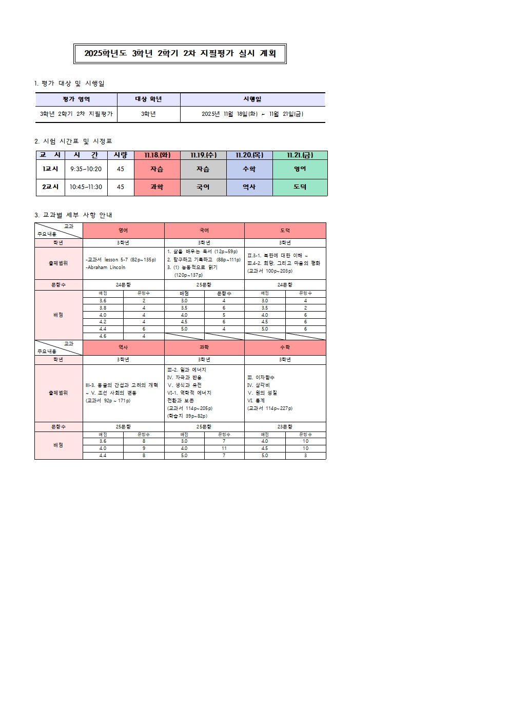 2025학년도 3학년 2학기 2차 지필평가 실시 계획 및 출제 범위 안내