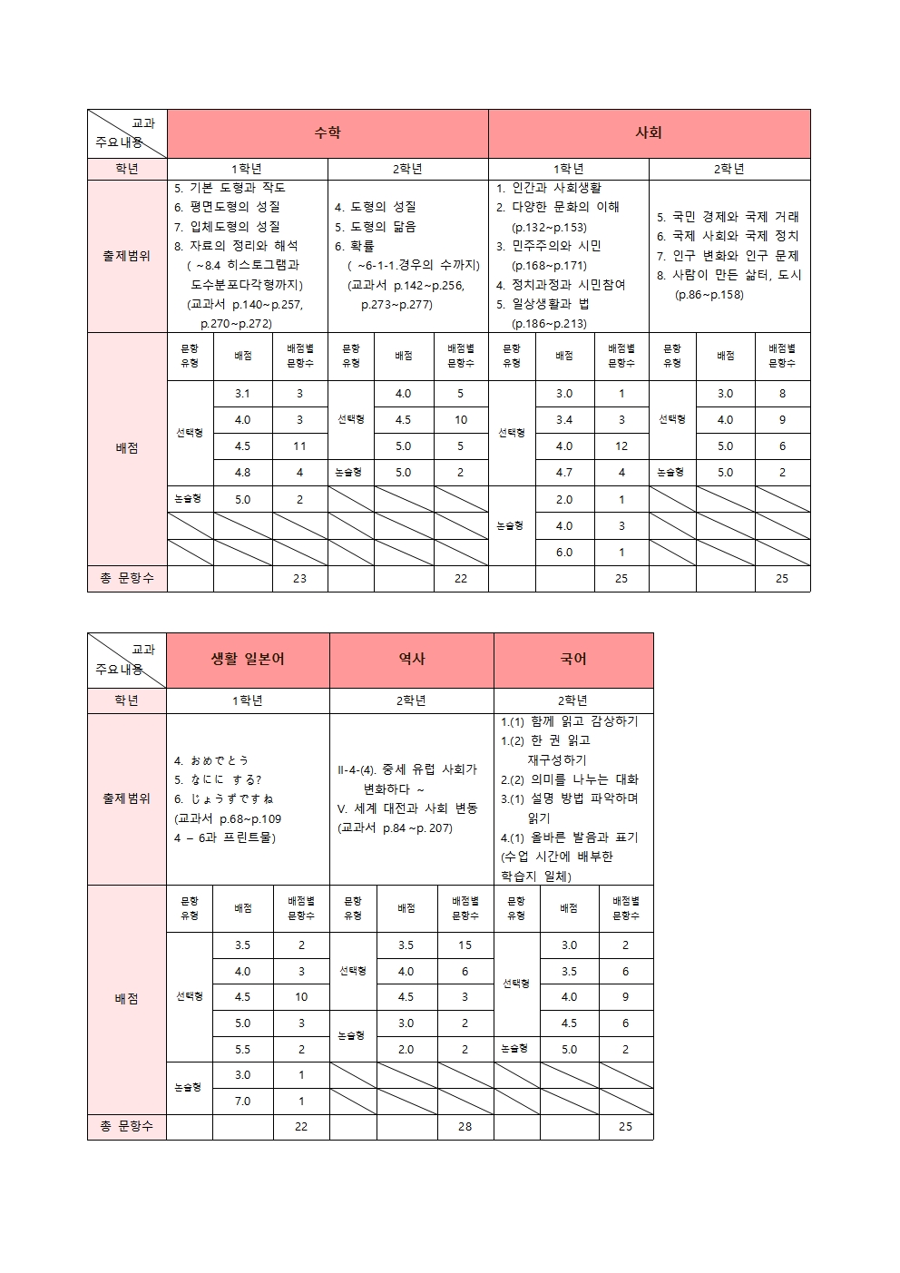 2025학년도 1,2학년 2학기 2차 지필평가 실시 계획 및 출제 범위 안내